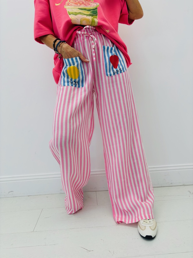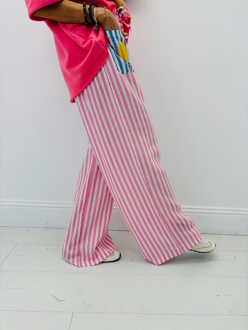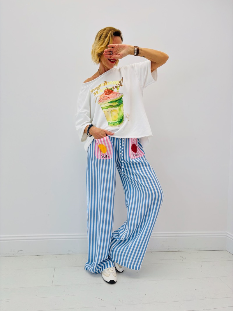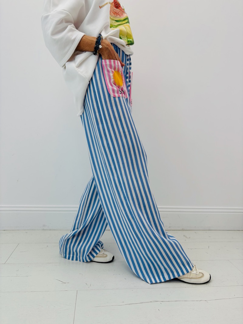 Ce pantalon rayé large séduit par son style estival et décontracté, sublimé par des détails graphiques pleins de fraîcheur. Avec ses rayures verticales et ses poches décoratives brodées, il apporte une touche fun et originale à la silhouette.