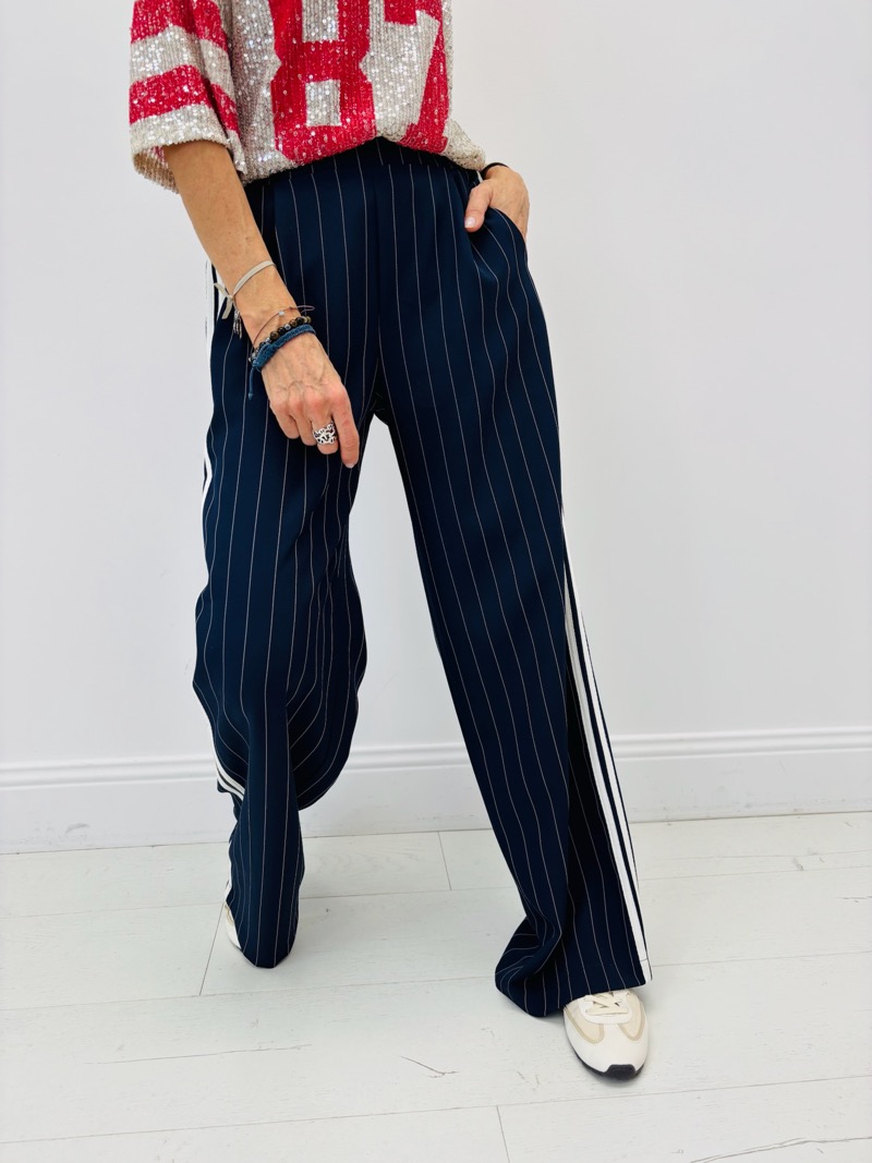 Ce pantalon revisite le tailoring classique avec une touche moderne et urbaine. Son tissu à rayures fines verticales apporte une élégance intemporelle, tandis que la bande contrastée sur le côté ajoute une note sportswear très tendance.