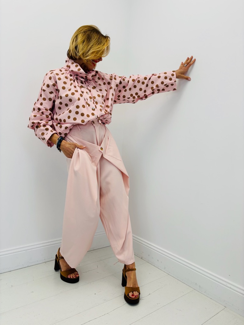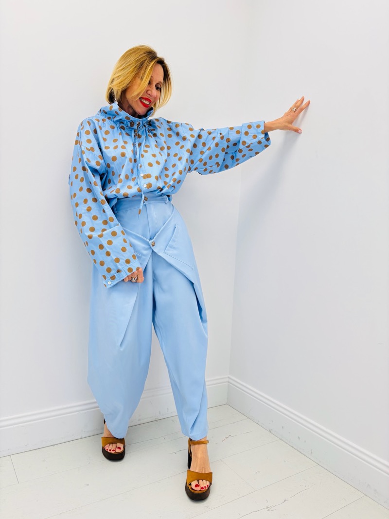À associer avec une blouse fluide ou une chemise pour équilibrer les volumes et structurer la silhouette. Il peut également être porté avec un top ajusté pour un look plus moderne et pointu.