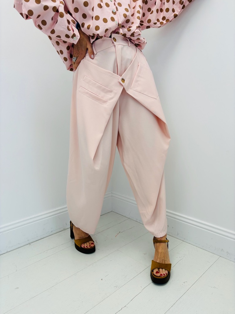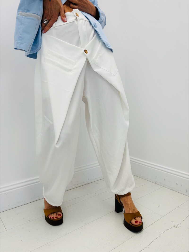 Une pièce forte au design original qui revisite le pantalon sarouel avec une touche contemporaine et élégante. Ce modèle séduit par sa coupe ample et son jeu de superposition à l’avant, créant un effet drapé unique et structuré.