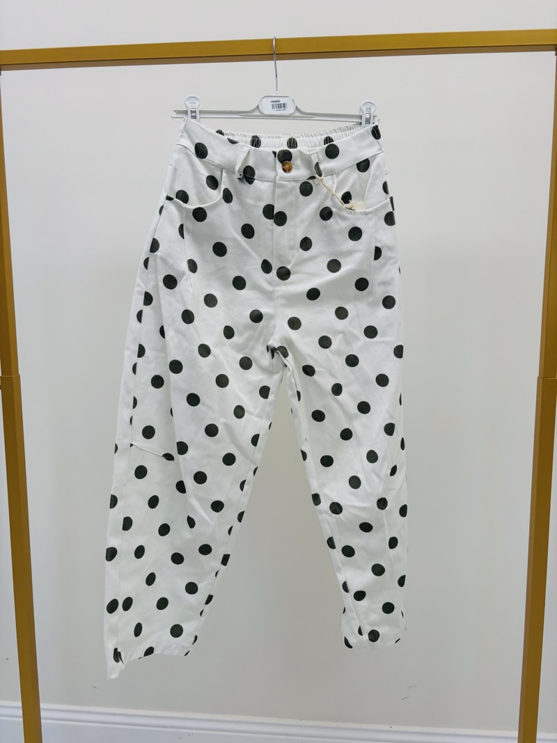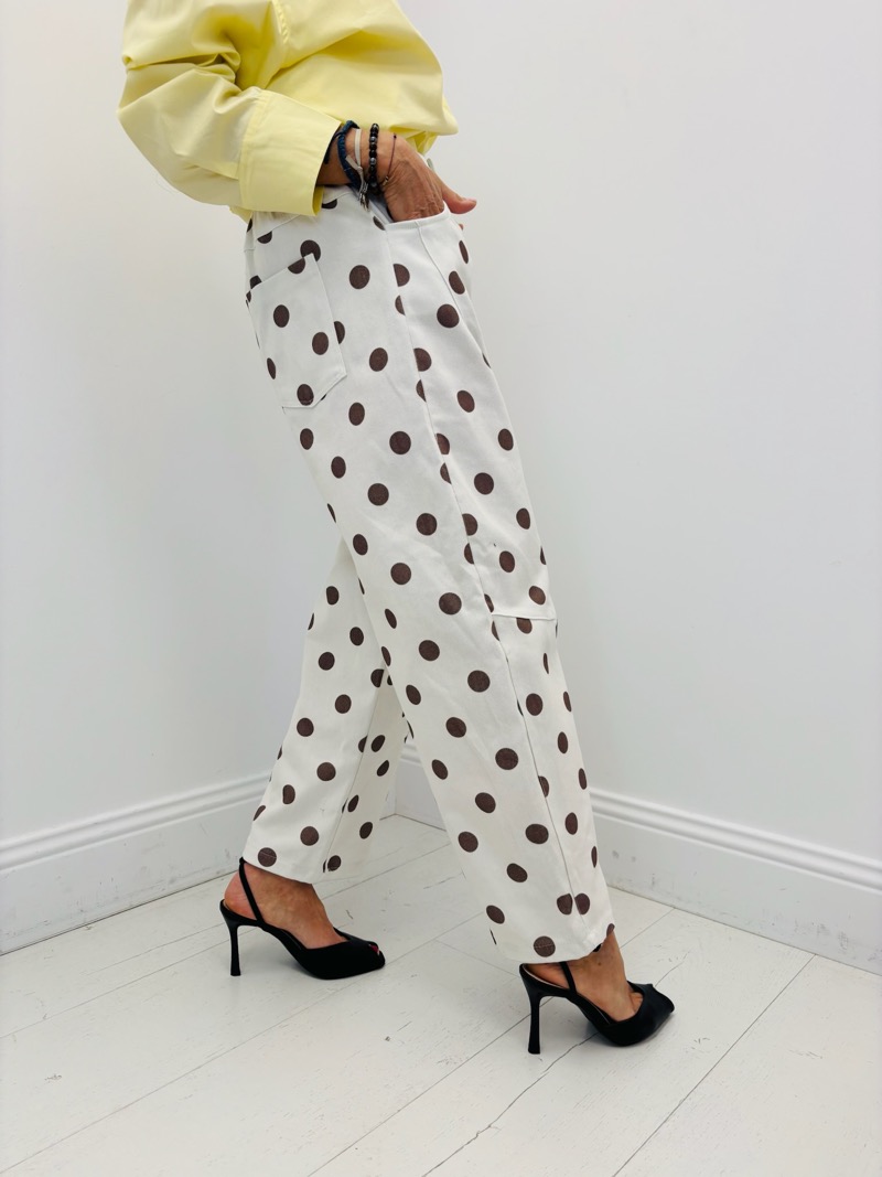 Apportez une touche de fraîcheur et d’originalité à vos collections avec ce pantalon en toile de jean revisité par un imprimé pois ultra tendance. Son style rétro chic, inspiré des silhouettes iconiques, en fait une pièce forte et facile à vendre en boutique.