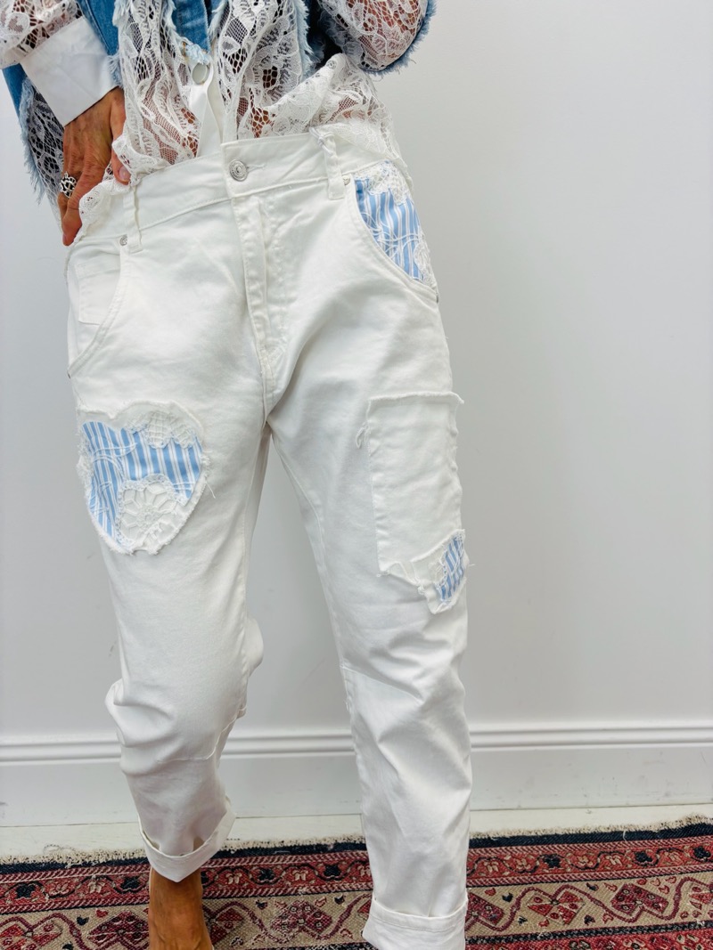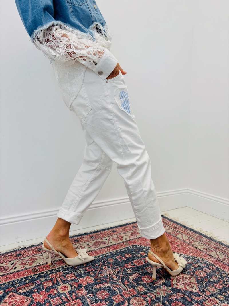 Les détails patchwork positionnés sur les poches et la jambe dynamisent la pièce tout en restant harmonieux grâce au contraste subtil entre le blanc denim et les inserts bleu rayé. C’est un modèle fort, idéal pour proposer une alternative originale au jean classique.