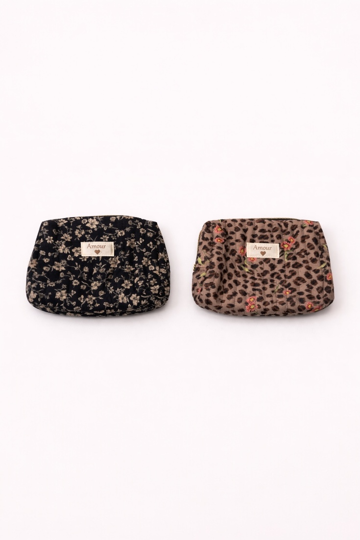Déclinée en version florale noire délicate ou en imprimé léopard revisité avec petites fleurs colorées, elle apporte une touche mode subtile tout en restant facile à associer. Le patch “Amour” accompagné d’un petit cœur renforce son identité romantique et féminine.