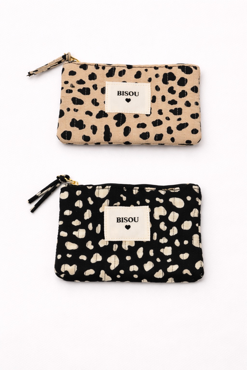 Au centre, un patch textile cousu met en avant l’inscription “BISOU” accompagnée d’un petit cœur minimaliste. Ce détail signature apporte une dimension lifestyle et affective qui plaît particulièrement en achat coup de cœur ou en idée cadeau. Les finitions sont soignées : couture apparente structurée, fermeture zippée résistante et double pompon assorti pour une touche féminine supplémentaire.