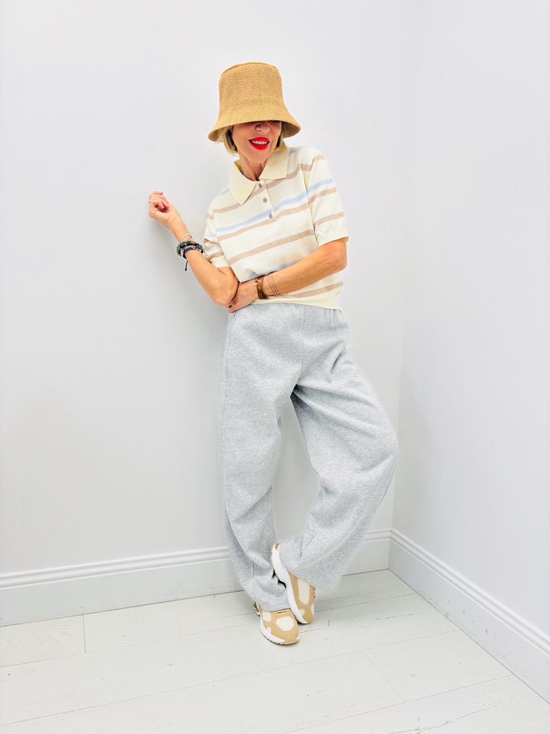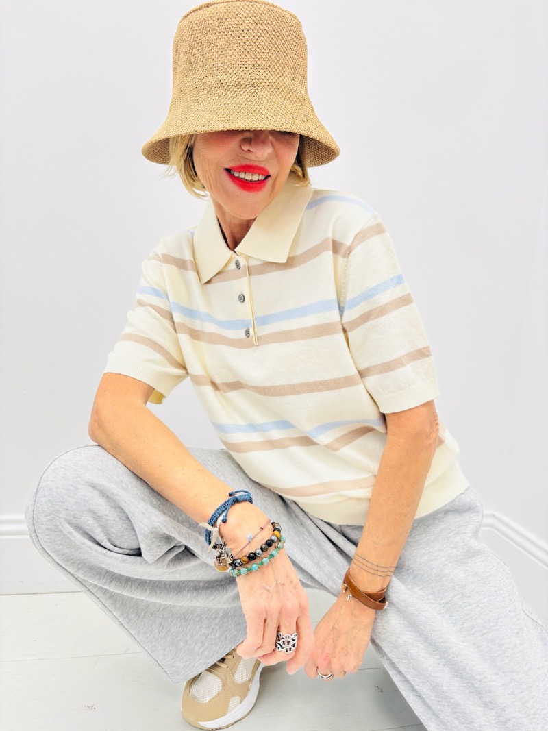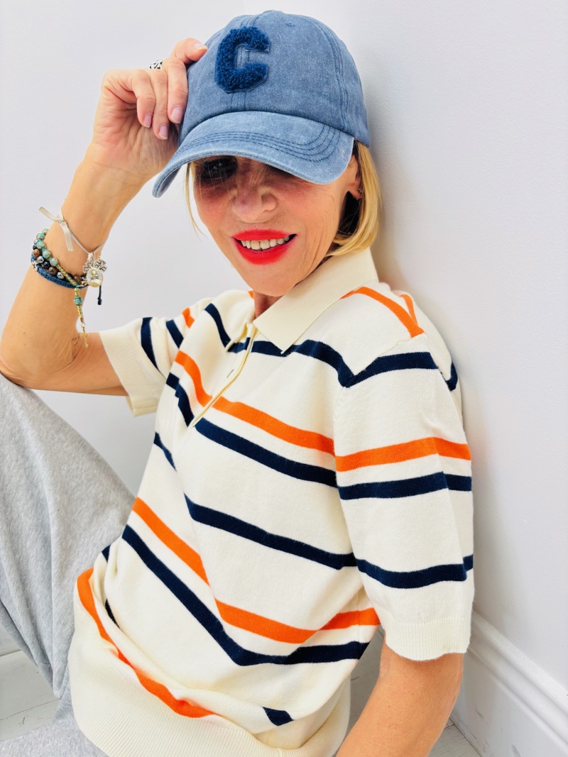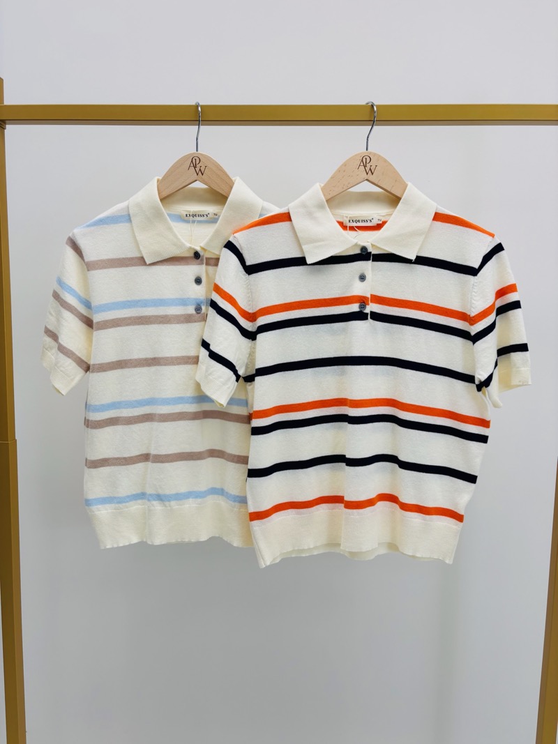 Décliné dans des harmonies douces (beige et bleu pastel) ou plus contrastées (marine et orange), il s’adapte facilement à différentes capsules : city, casual ou weekend premium. Les manches courtes et la coupe légèrement ajustée assurent une silhouette féminine tout en restant confortable.