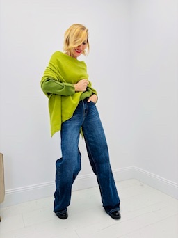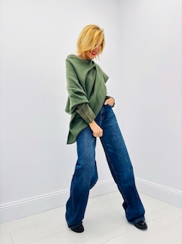 Porté ici sur un jean large, il crée un effet enveloppant très féminin. Sa coupe asymétrique apporte du mouvement et allonge la silhouette, tandis que ses coloris lumineux ou neutres permettent de varier les styles selon la saison.