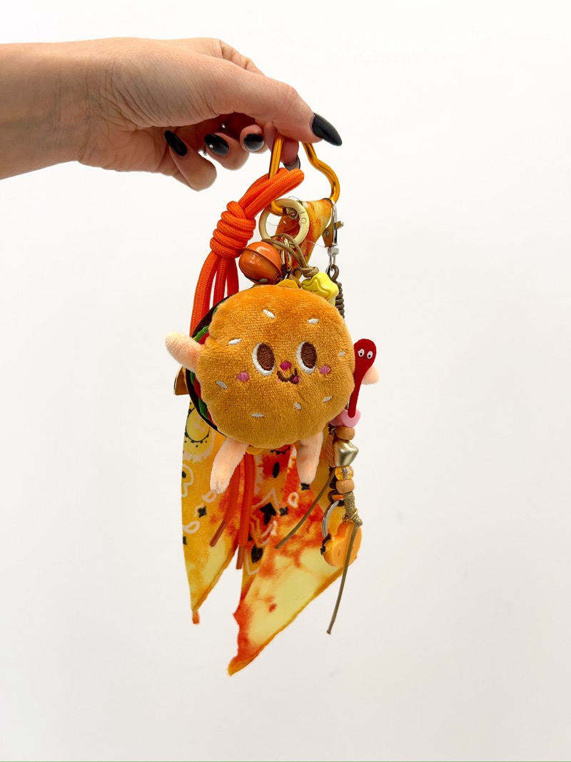 La breloque centrale en forme de burger, toute douce et moelleuse, attire immédiatement l’œil. Son design ludique et gourmand apporte une note humoristique très appréciée, idéale pour se démarquer. Autour, on retrouve un mélange harmonieux de cordons colorés, de perles fantaisie, de petits charms et d’éléments textiles imprimés qui renforcent son esprit fun et créatif.