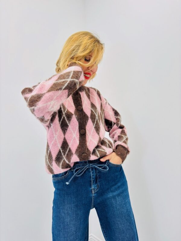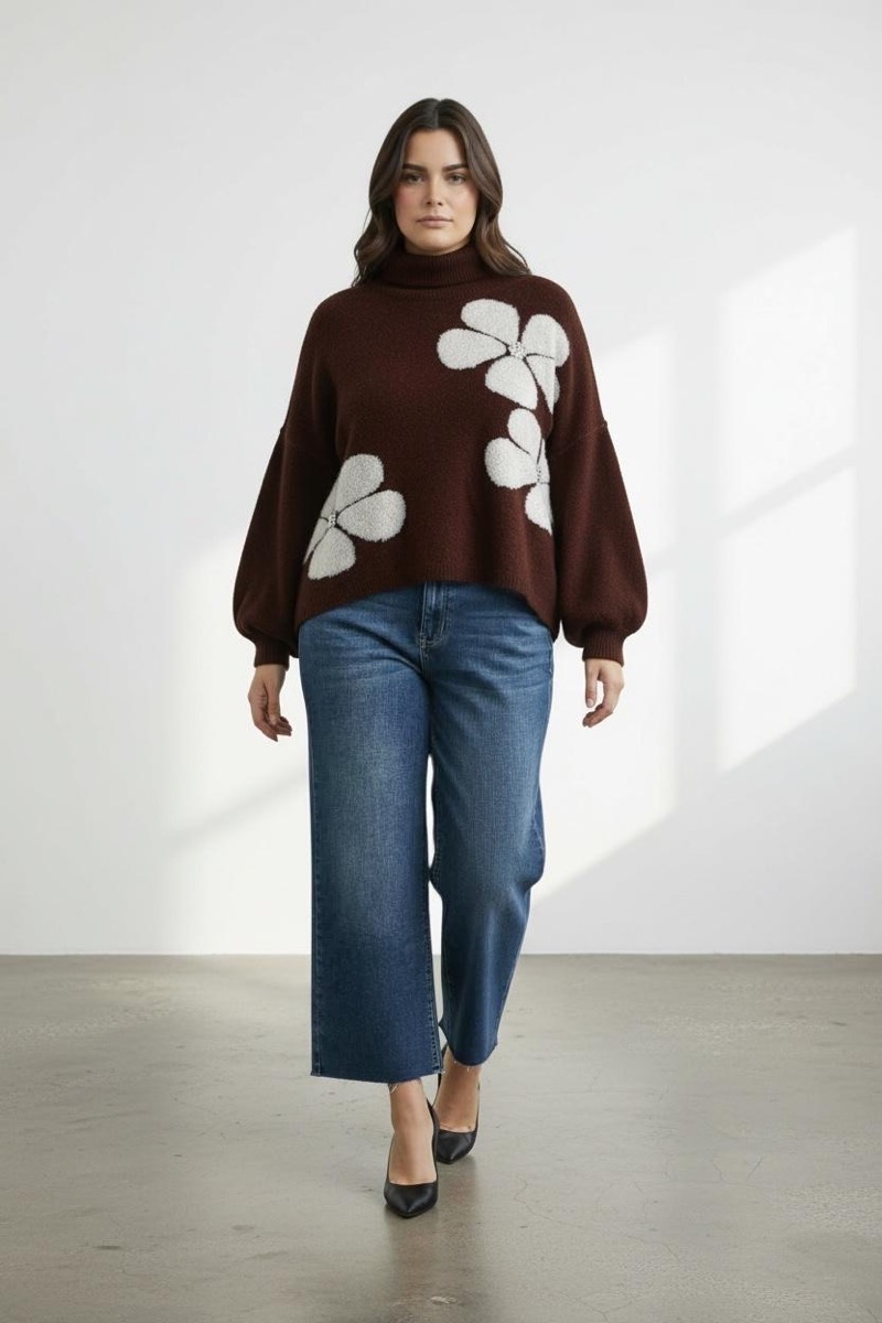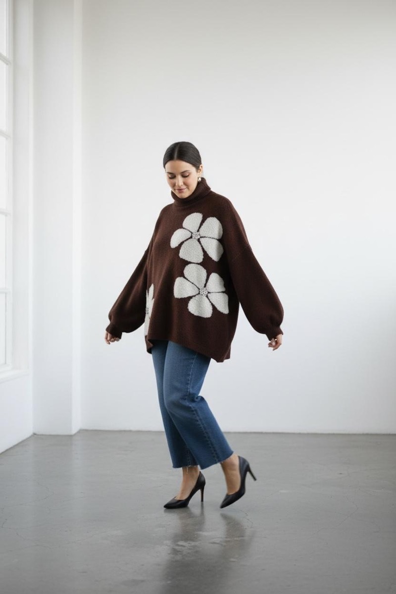 La maille de qualité présente un tombé structuré qui ne colle pas au corps, ce qui en fait un modèle particulièrement flatteur pour les silhouettes pulpeuses. Les fleurs blanches, texturées et délicatement placées, apportent une touche graphique et lumineuse qui contraste harmonieusement avec le fond chocolat/bordeaux profond du pull. Ce contraste visuel donne une allure sophistiquée, moderne et féminine, parfaite pour toutes les occasions.