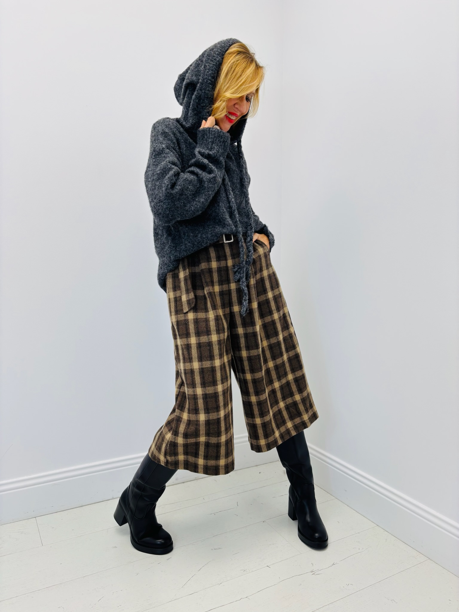 Porté ici dans sa version gris anthracite, associé à un pantalon à carreaux et des bottes hautes, il crée une allure à la fois urbaine et cocoon.