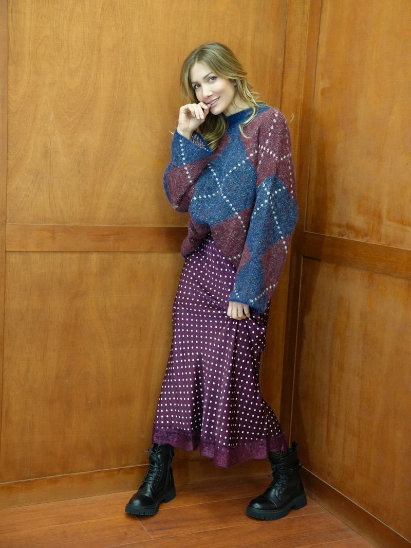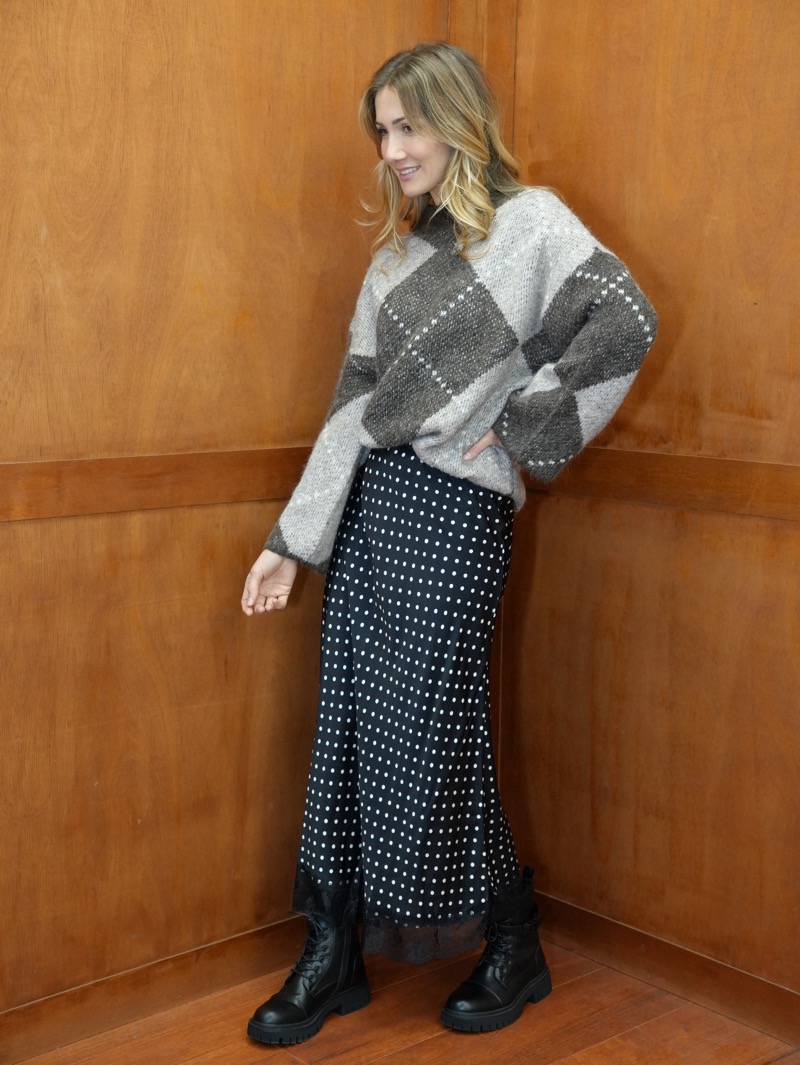 Un mélange inattendu mais ultra tendance : la fluidité de la jupe contraste avec la structure du pull à motifs, créant un look moderne et éditorial. Parfait pour une cliente qui aime les associations mode et un brin décalées.