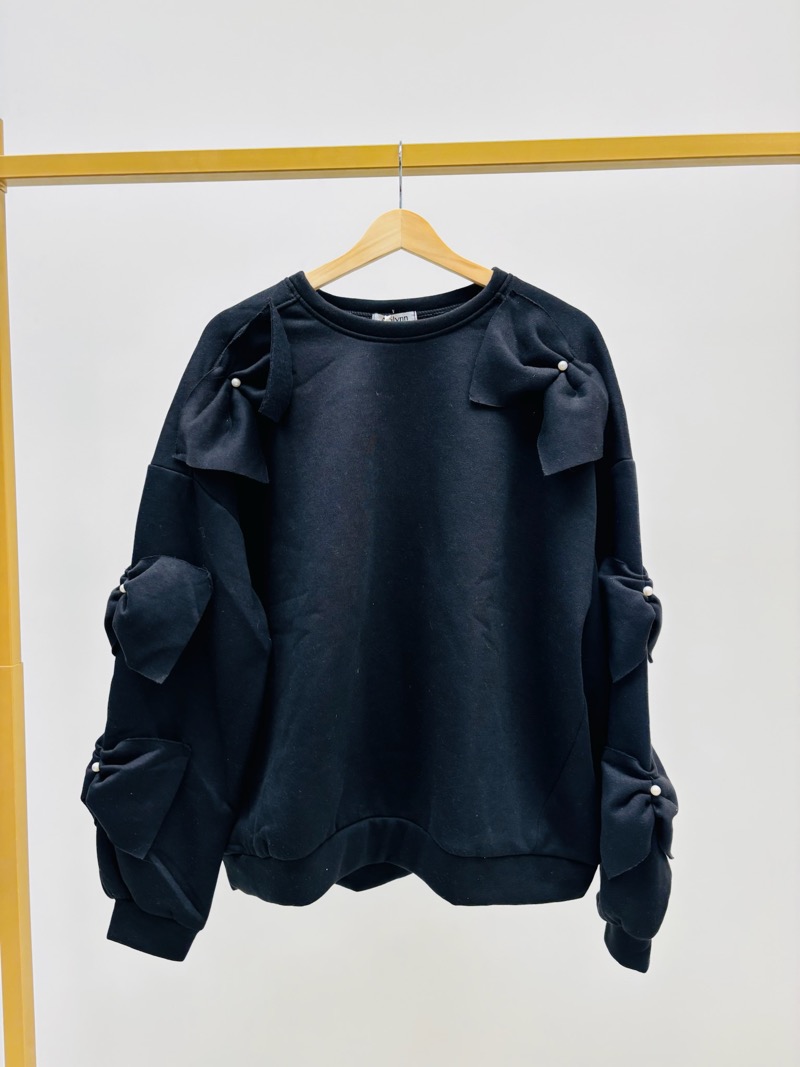 Sa coupe sweat décontractée est sublimée par des nœuds volumineux ornés de petites perles, positionnés le long des manches pour un effet couture très actuel.