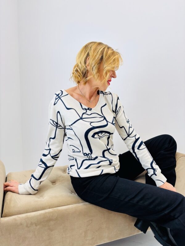 Ce modèle séduit particulièrement grâce à son impression papillon multicolore, un motif vibrant et riche en détails qui attire l’œil et donne un véritable esprit “peinture artistique”. Le mélange de teintes chaudes — rouge, orange, jaune — et de nuances plus froides — bleu, indigo, turquoise — crée une harmonie colorée qui illumine la silhouette et apporte une dynamique moderne à la tenue. Ce type de pull graphique fait partie des best-sellers dans les boutiques de prêt-à-porter car il permet aux clientes de composer des looks simples mais visuellement très impactants.