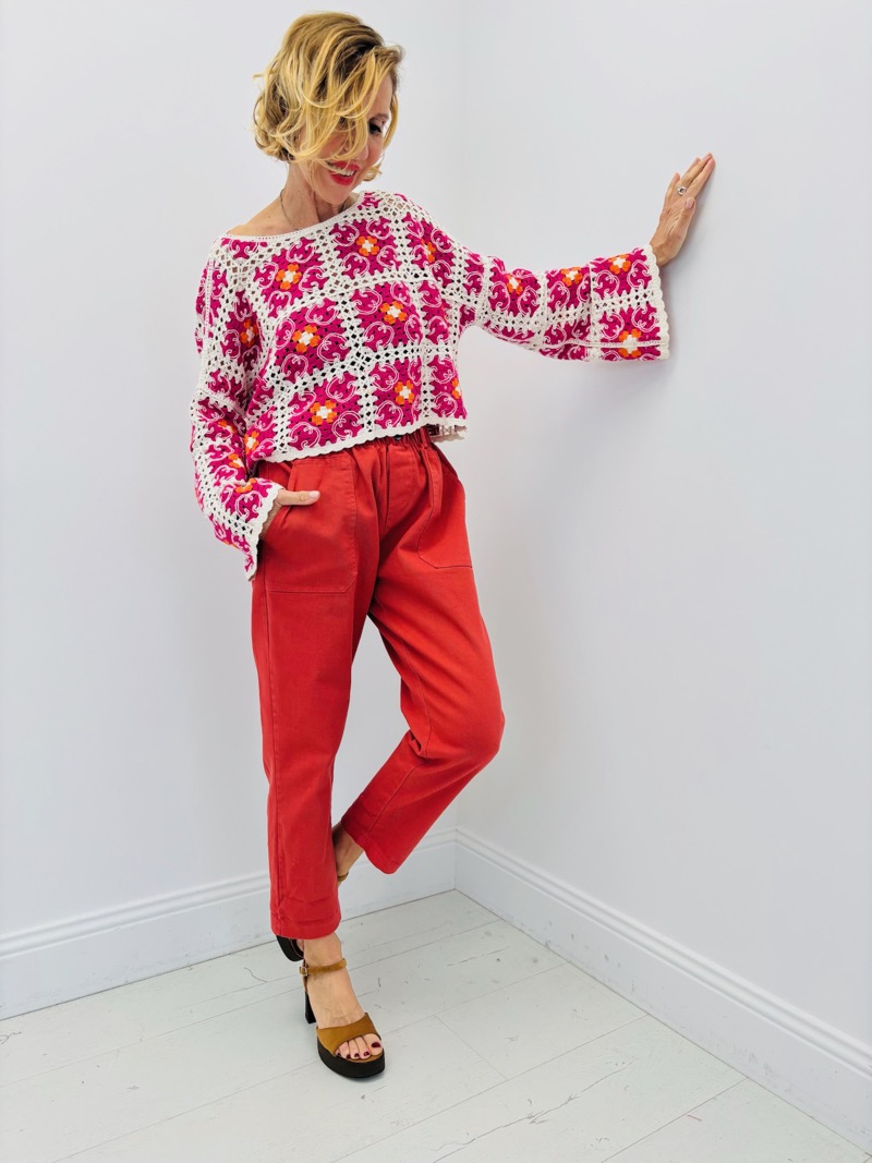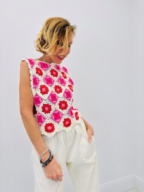 Les couleurs vibrantes associées à la base écrue apportent relief et modernité à cette pièce tout en conservant l’authenticité du crochet traditionnel. Son design ajouré laisse apparaître subtilement la peau ou un top porté en dessous, créant une silhouette légère et féminine idéale pour la mi-saison et les journées estivales.