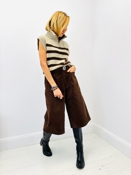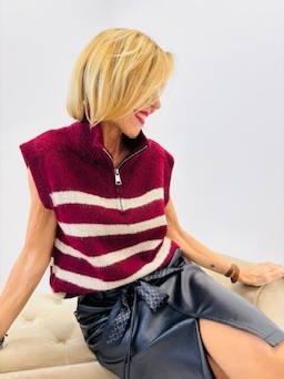 Le débardeur camionneur fait son grand retour cette saison dans une version chic et contemporaine. Avec son col zippé et sa maille douce contenant 38% de laine, il combine chaleur et style. Son motif rayé intemporel et sa coupe légèrement loose en font une pièce idéale pour superposer sur une chemise, un pull fin ou même une robe.