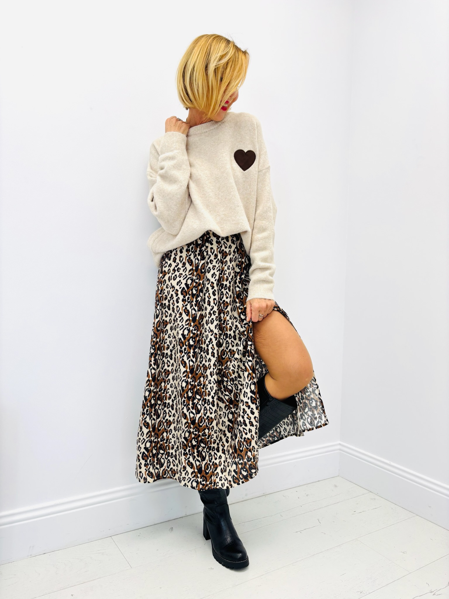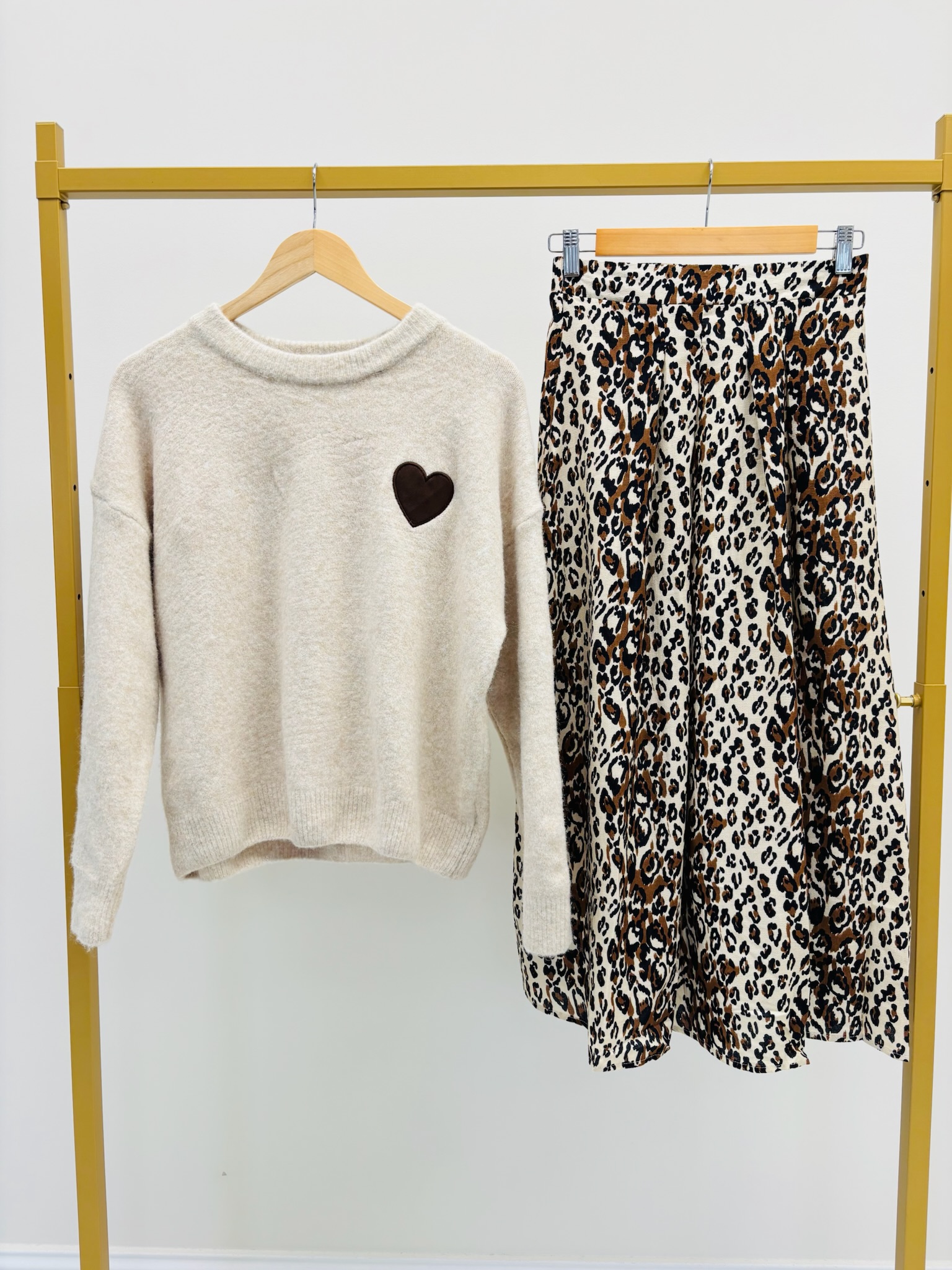 Porté ici avec une jupe imprimée léopard, il joue sur les contrastes entre féminité et esprit cocoon, idéal pour un look automne-hiver original.
