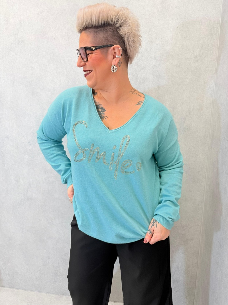 Ce pull grande taille est une véritable pièce coup de cœur, pensée pour allier confort absolu, féminité et message positif. Son coloris frais et lumineux apporte instantanément de l’éclat à la silhouette, tandis que son inscription “Smile” en strass délicatement scintillants ajoute une touche de fantaisie chic, sans jamais tomber dans l’excès. C’est le genre de pull facile à porter, qui donne bonne mine et qui s’adapte à toutes les morphologies.