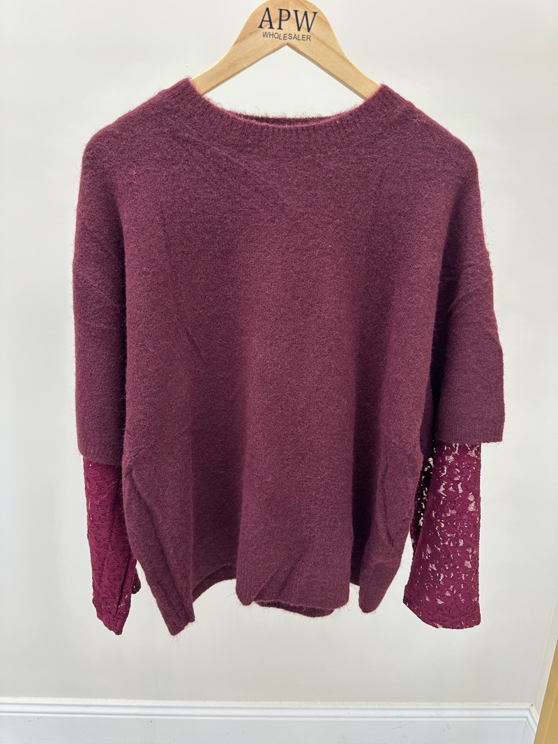 Pull grande taille bordeaux à manches dentelle – Élégance chic et moderne