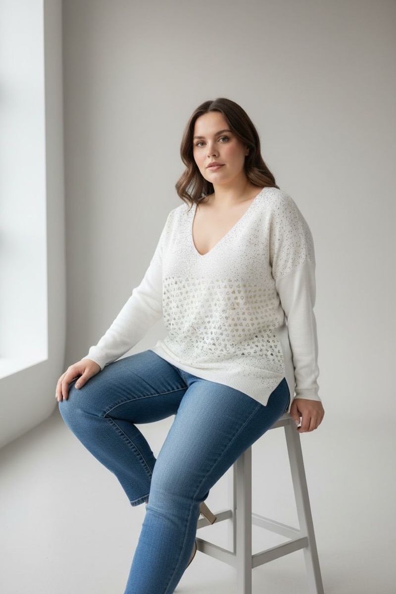 Pull grande taille col V imprimé cœurs – Douceur lumineuse & féminité moderne