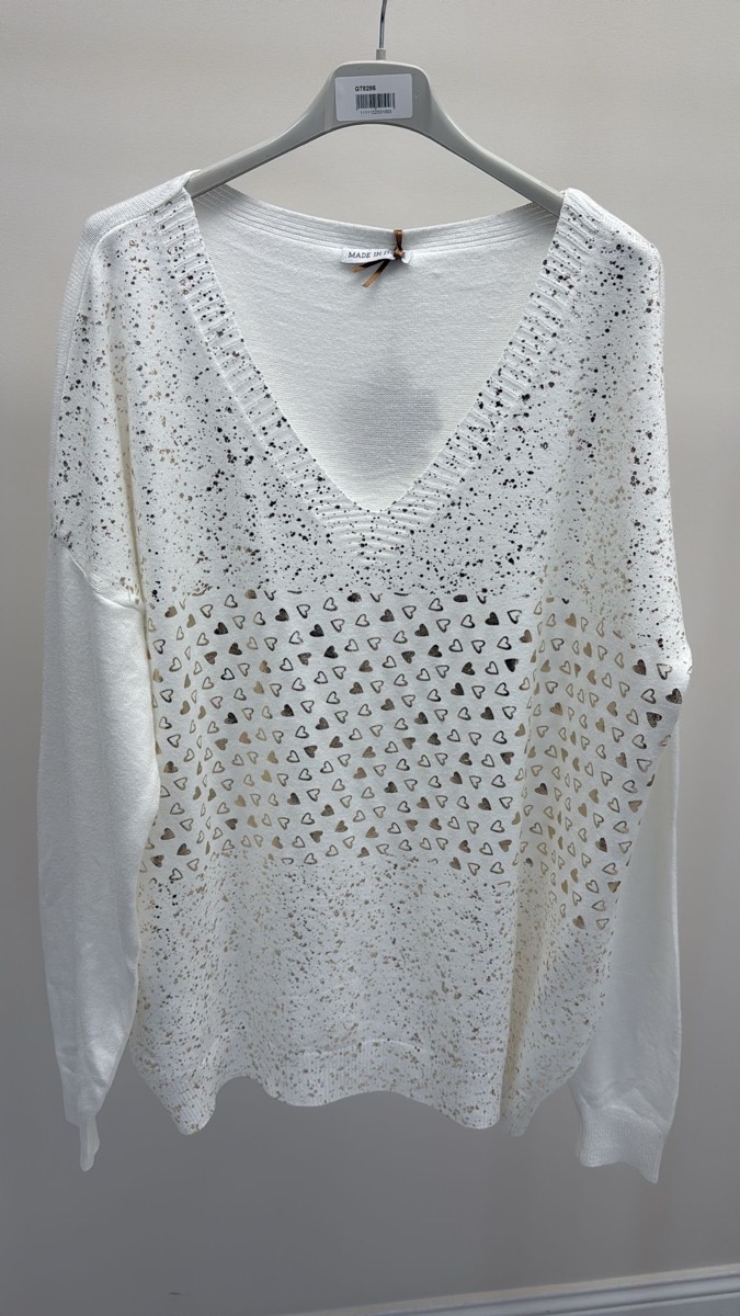 Son col V joliment travaillé met en valeur le décolleté sans être trop plongeant, offrant une touche féminine et flatteuse. Le devant du pull se distingue par un imprimé de petits cœurs délicatement contrastés, qui apporte une note romantique et tendance sans surcharger la pièce. L’ensemble est subtilement équilibré par un effet moucheté sur le reste du pull, donnant du relief et une allure moderne à ce modèle grande taille.