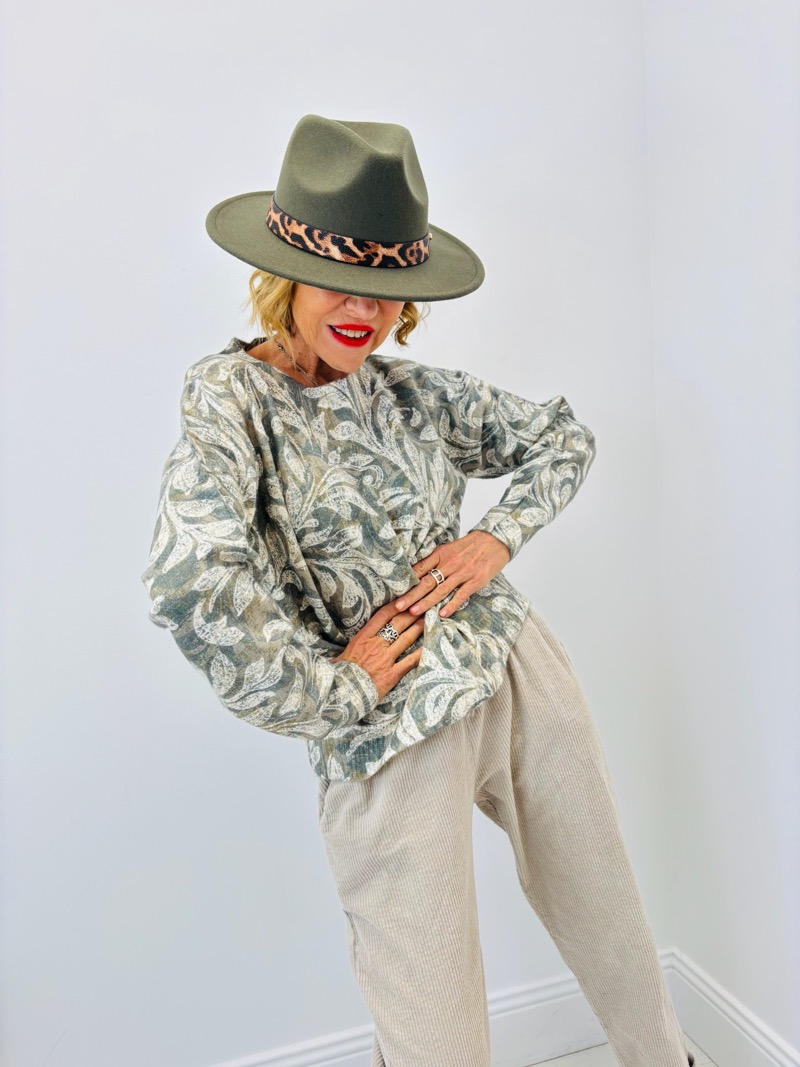 Porté ici avec un pantalon velours beige et un chapeau vert, le pull crée un look bohème, moderne et ultra stylé.