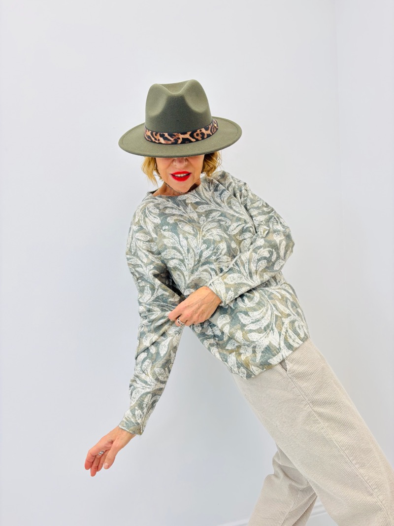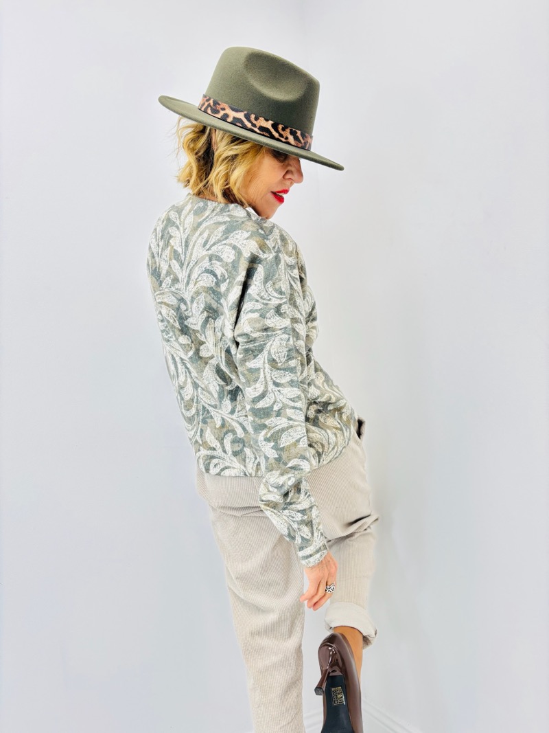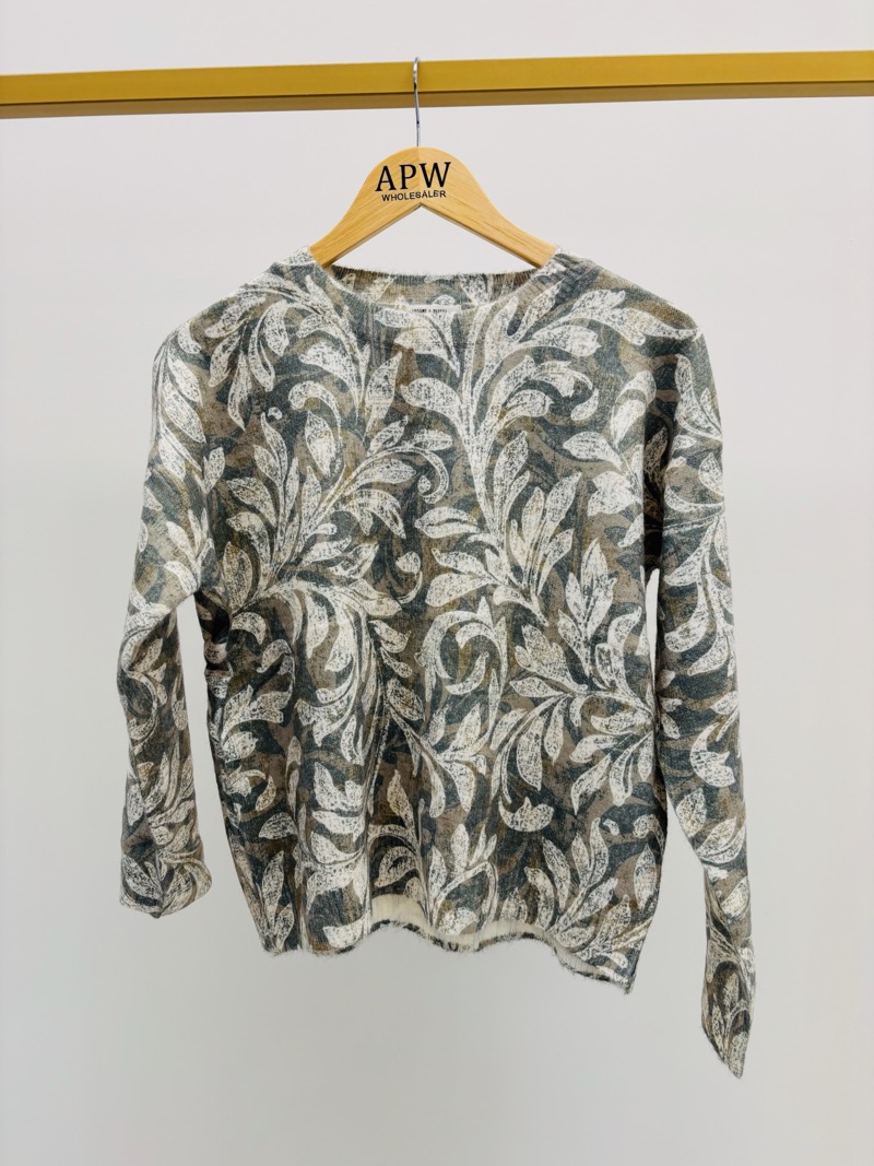 Le pull 1563 est une pièce originale et élégante, sublimée par un motif feuillage artistique mêlant nuances de vert, beige et blanc cassé.