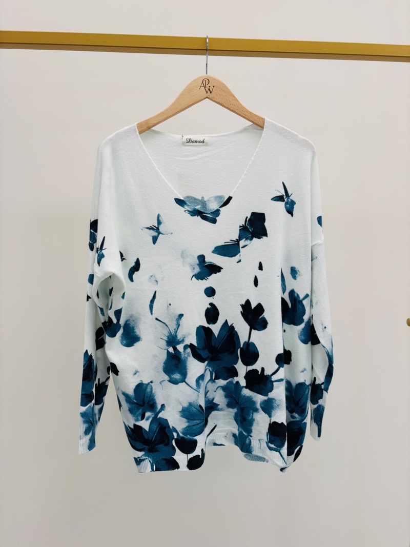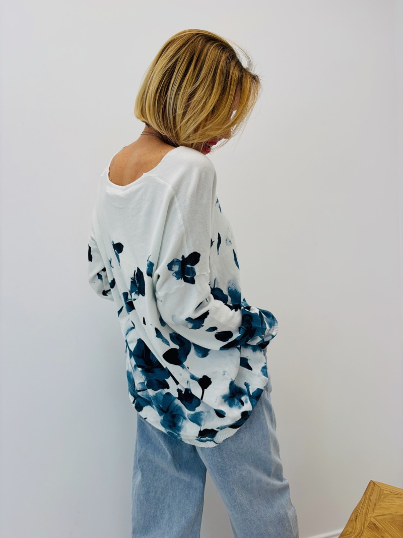 Chic, doux et facile à porter, ce pull imprimé floral se distingue par son motif aux nuances bleu nuit et bleu pétrole sur fond clair. Son design délicatement artistique apporte une touche sophistiquée tout en restant parfaitement commercial.