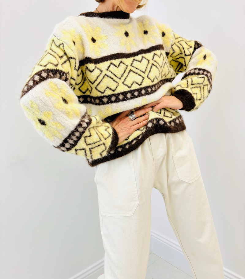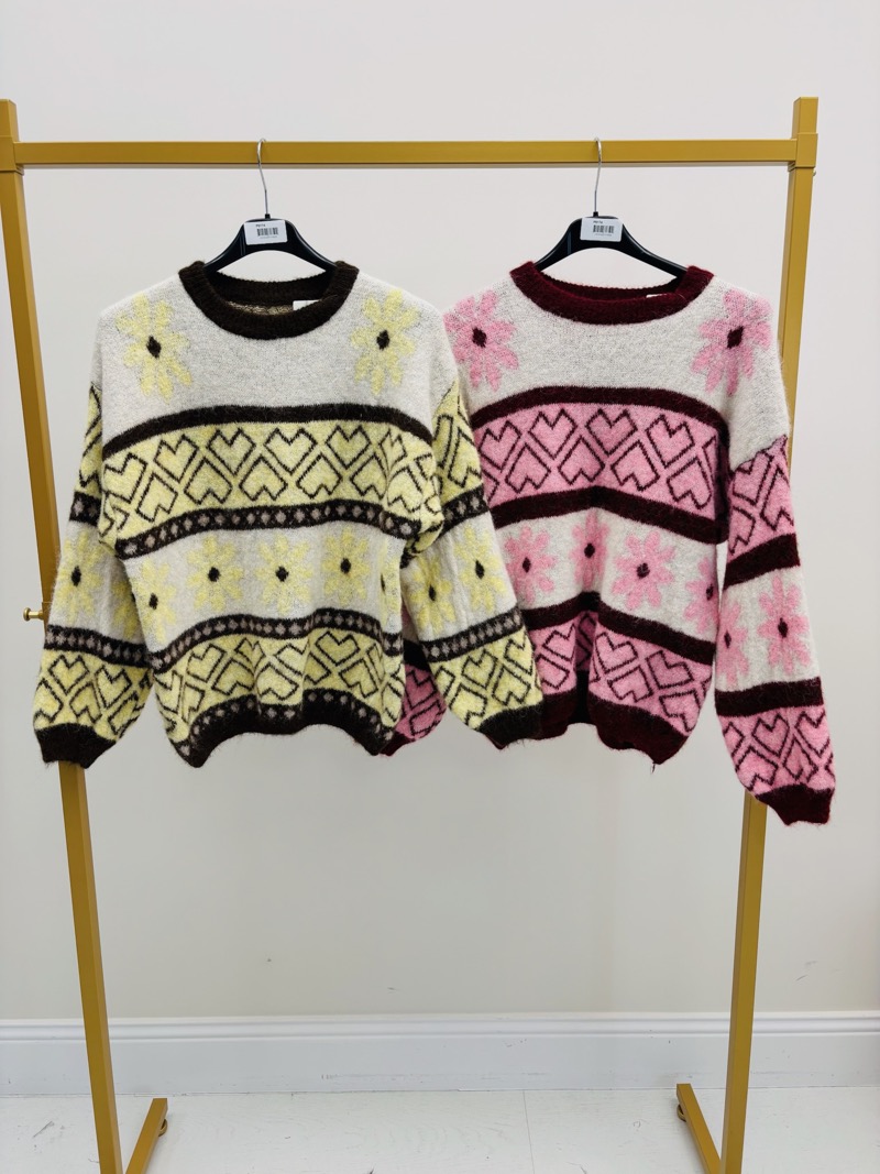 Ce pull jacquard est une pièce pleine de charme et de personnalité, inspirée d’un esprit italien vintage chic, mêlant motifs graphiques et douceur cocooning. Véritable coup de cœur de saison, il se distingue par son jacquard travaillé, associant motifs cœurs, fleurs stylisées et bandes décoratives, pour un rendu à la fois original, chaleureux et ultra tendance.