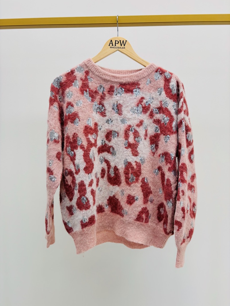 Le pull 90105 revisite l’imprimé léopard dans une version douce et lumineuse grâce à ses sequins intégrés directement dans la maille.