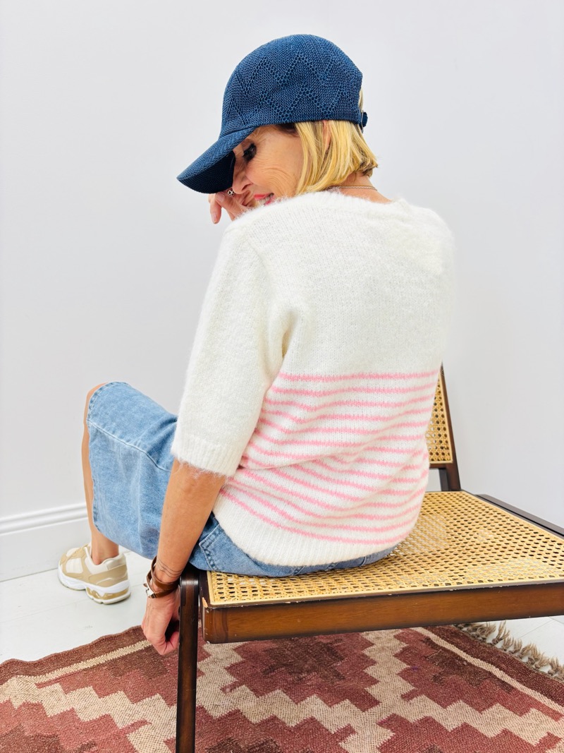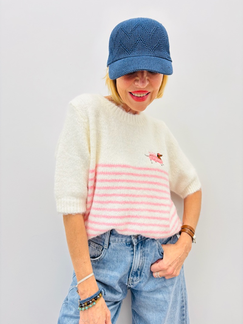 Ce pull en maille douce séduit par son allure tendre et lumineuse. Sa base écrue délicate est sublimée par de fines rayures rose pastel sur la partie inférieure, créant un contraste subtil et féminin.