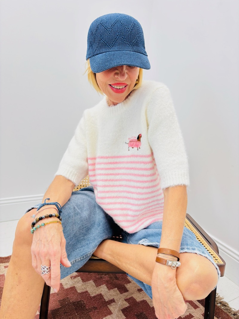 Il peut également se superposer sur une chemise blanche pour un look plus structuré ou être porté seul pour une allure casual chic. Ajouté à des baskets ou des accessoires pastel, il renforce son esprit frais et féminin.