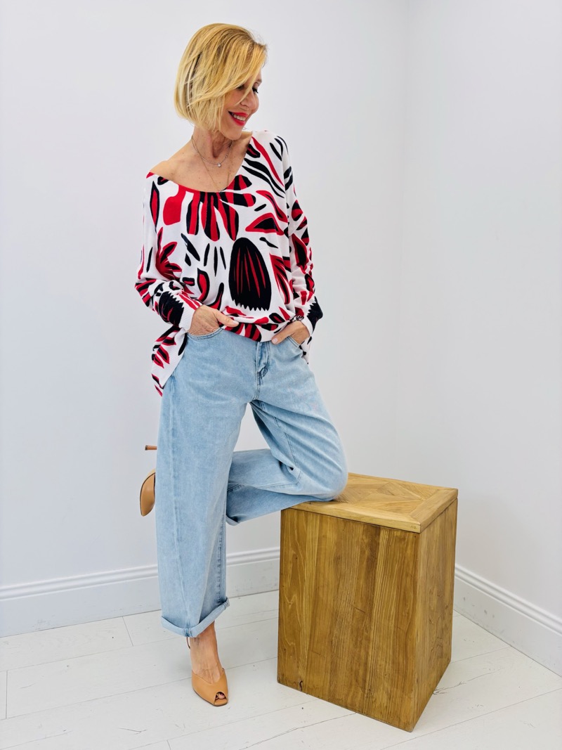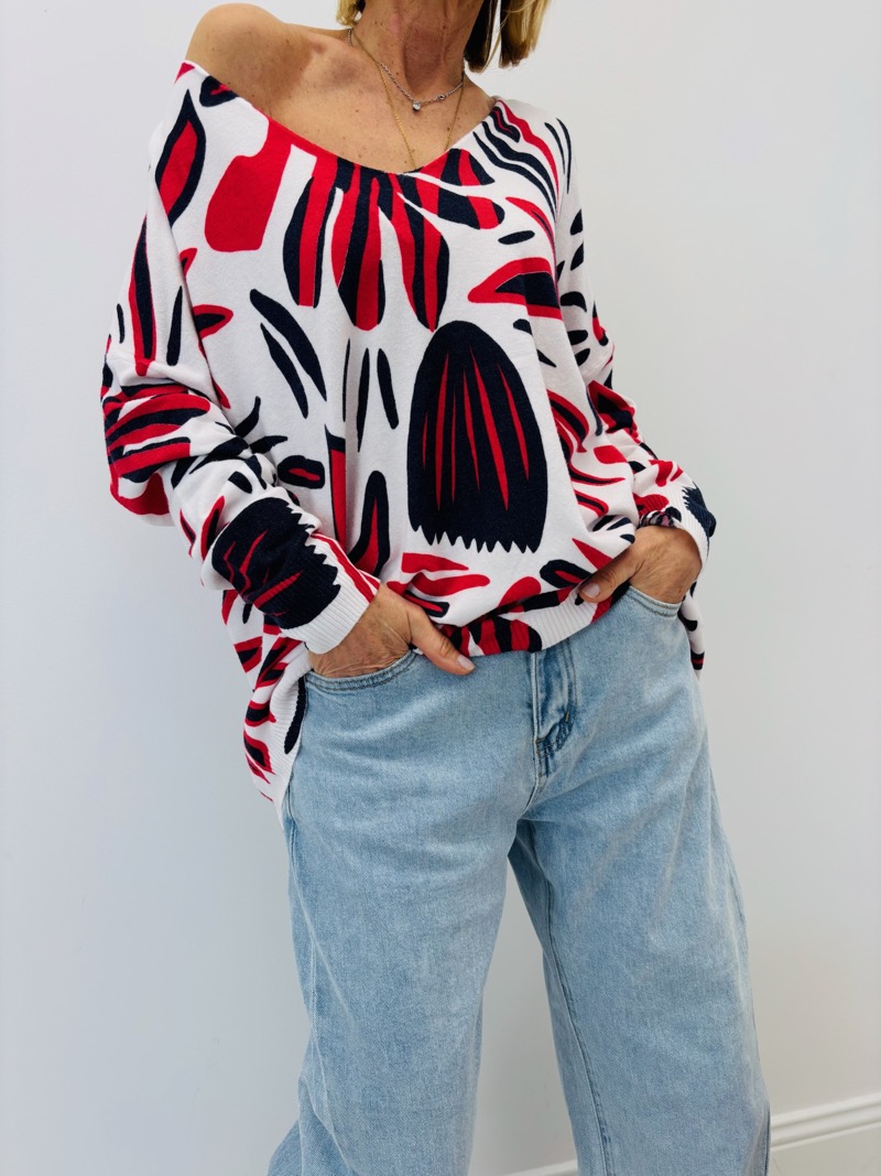 Ce pull en maille fluide à col V séduit par son imprimé végétal graphique aux contrastes puissants. Sur un fond clair lumineux, les motifs rouge intense et noir profond créent un jeu visuel dynamique et moderne. Une pièce forte, idéale pour apporter du caractère à une collection tout en restant facile à porter.