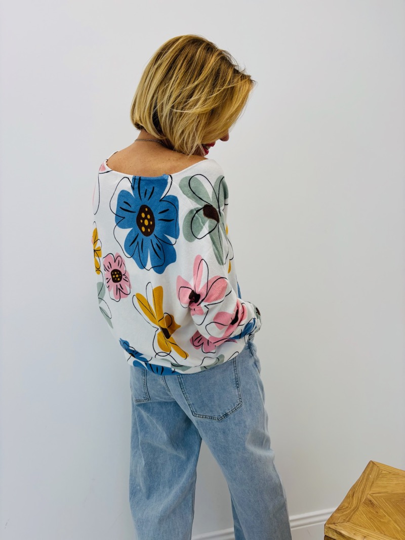 Ce pull en maille fluide à col V incarne parfaitement l’élégance décontractée et la douceur des beaux jours. Son fond clair illumine la silhouette tandis que son imprimé floral oversize joue avec des nuances pastel et naturelles : rose poudré, bleu ciel, vert sauge, jaune doux et touches graphiques délicates.