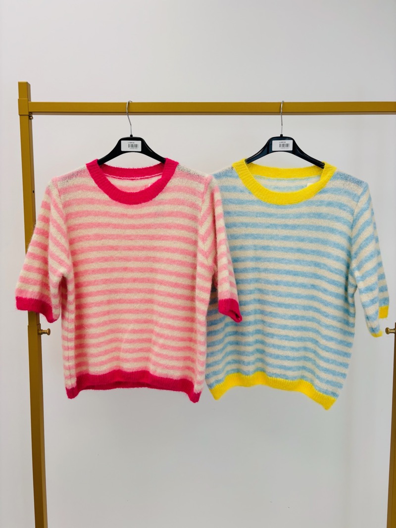 Ce pull manches courtes revisite la maille avec fraîcheur et modernité. Son jeu de rayures contrastées et ses finitions colorées apportent une touche dynamique et lumineuse, idéale pour dynamiser une collection printemps-été.