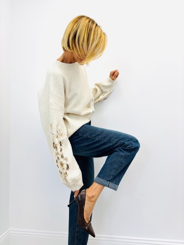 Ce pull séduit par ses détails en sequins brodés sur les manches, apportant une touche d’éclat et d’élégance.