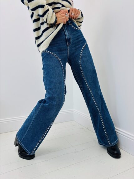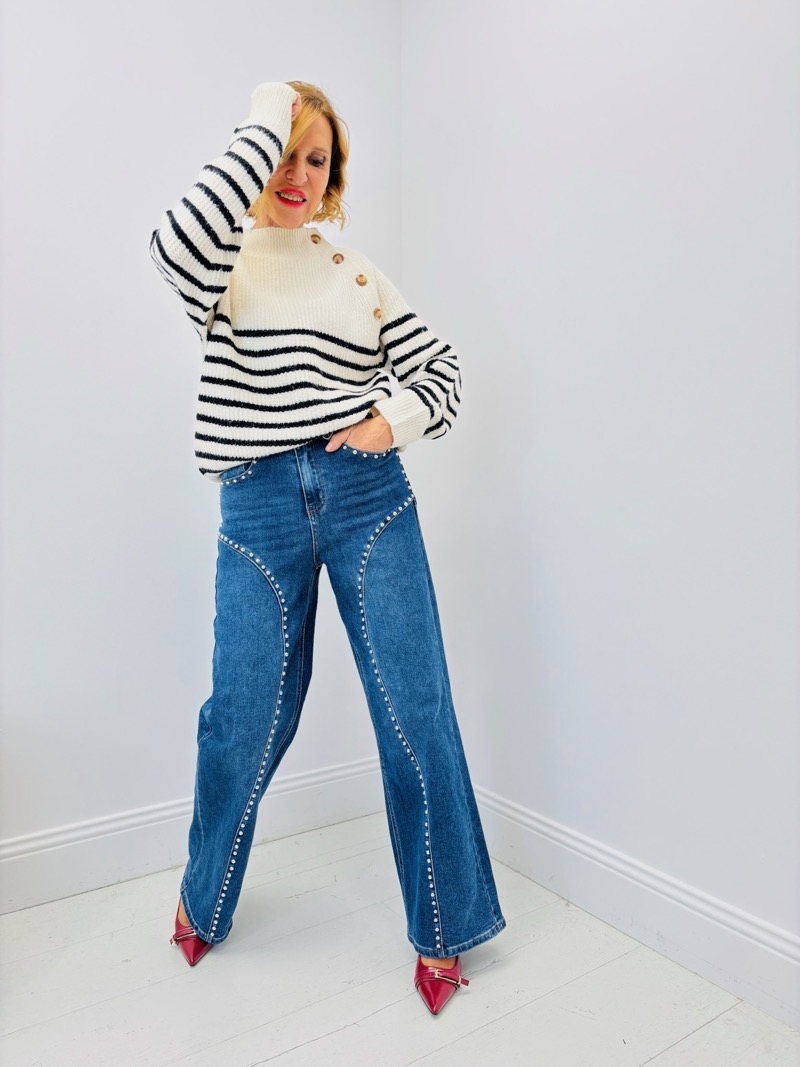 Porté ici avec un jean perlé, le pull marinière crée un look chic et moderne.