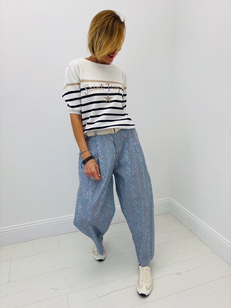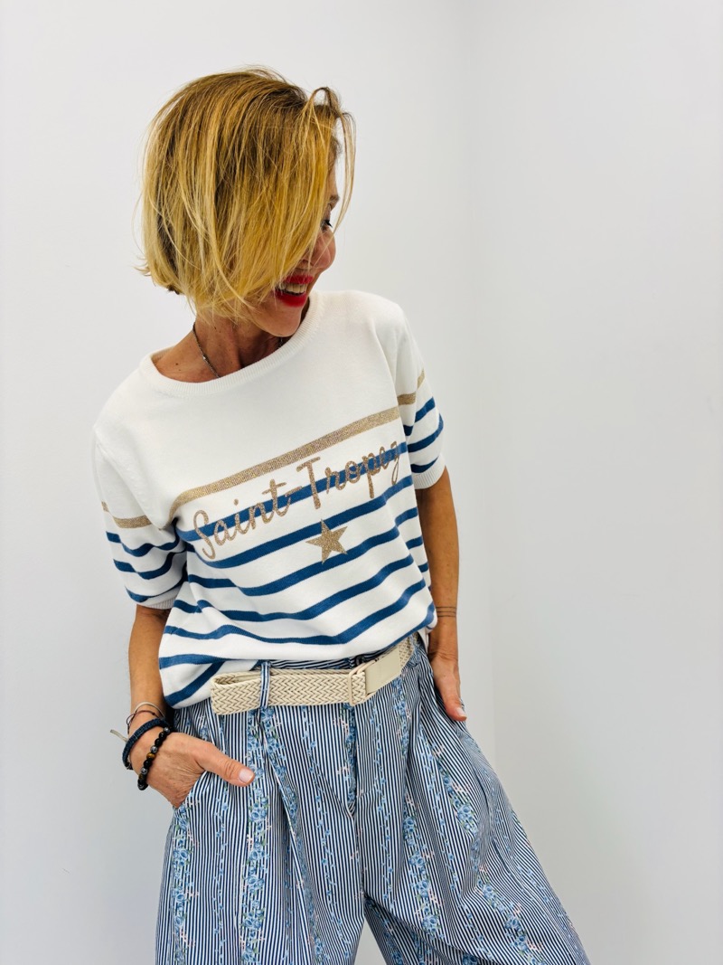 Craquez pour ce pull manches courtes à l’esprit marinière revisité, une pièce incontournable pour une allure élégante et estivale. Son design rayé intemporel est sublimé par une bande dorée et une inscription “Saint-Tropez” accompagnée d’une étoile, apportant une touche lumineuse et premium.