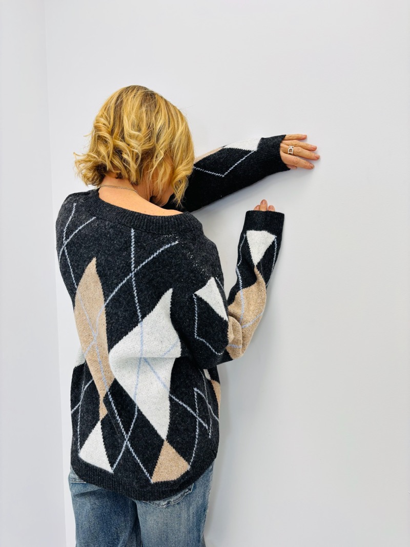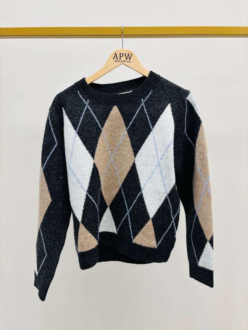 Les couleurs sobres et élégantes — mélange de noir, beige, blanc cassé et touches de bleu clair — permettent de créer des looks raffinés, modernes et faciles à assortir. La disposition des losanges met visuellement en valeur la silhouette et donne au pull un style structuré sans être rigide. Son design géométrique sobre en fait une pièce forte mais totalement portable au quotidien.