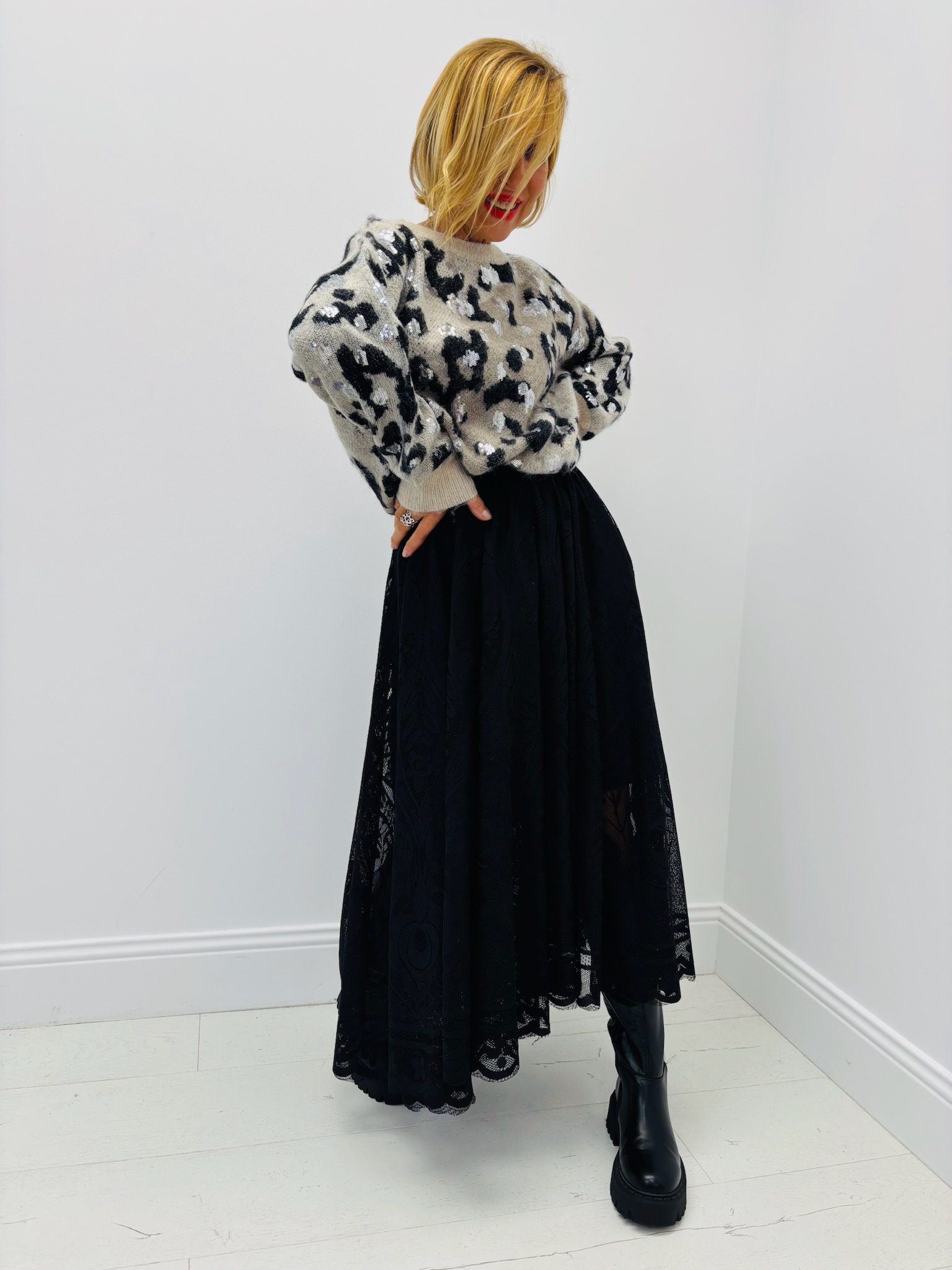 Un pull tendance et lumineux qui allie douceur et éclat ✨ Sa maille chaude enrichie en laine offre un confort agréable, tandis que son motif léopard rehaussé de sequins discrets apporte une touche chic et féminine à vos tenues d’hiver.