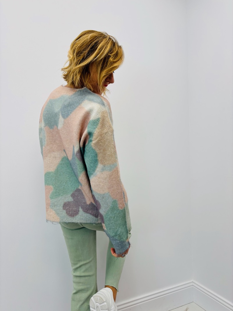 Ce pull se distingue par son motif abstrait multicolore aux tons doux et harmonieux, offrant un rendu visuel moderne et très tendance. Les formes irrégulières et les nuances pastel créent un effet artistique subtil, facile à intégrer dans une collection casual chic.
