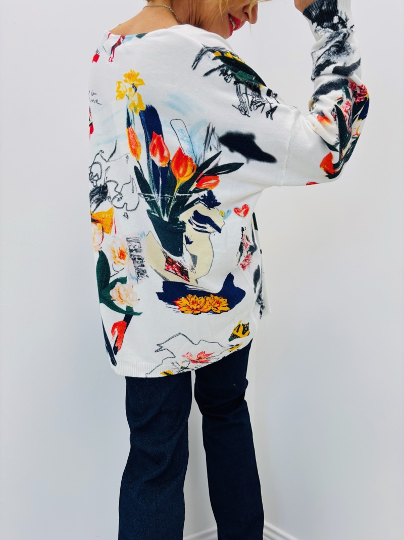 Pull Oversize Artistique Fleurs & Esquisses – Viscose & Modal Ultra Doux