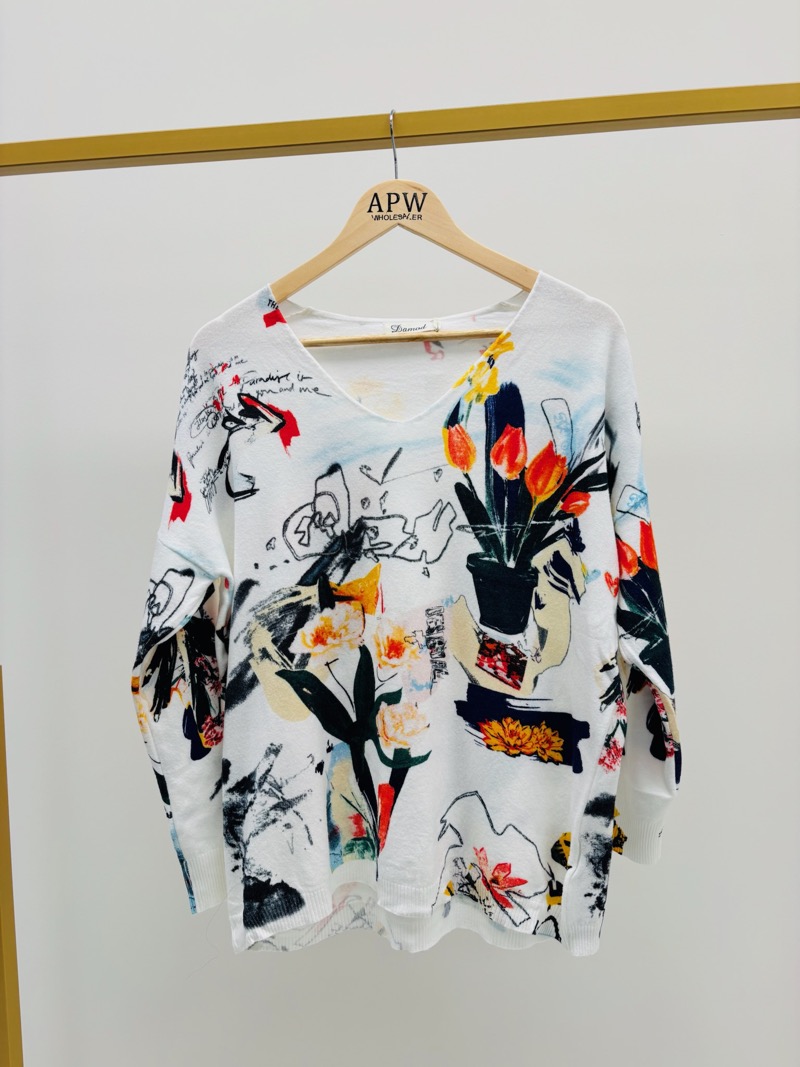 Son imprimé artistique — mélange d’esquisses, de fleurs colorées et de touches picturales abstraites — en fait une véritable pièce statement. Les nuances éclatantes de rouge, jaune, vert et noir se détachent harmonieusement sur un fond blanc lumineux. Cet effet “tableau moderne” attire immédiatement l’œil et transforme une tenue simple en look unique. Ce type de design est particulièrement apprécié par les clientes à la recherche de pièces originales, expressives et faciles à associer.