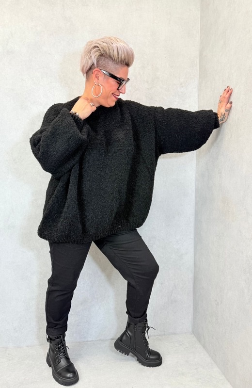 Sa maille bouclette moelleuse offre une texture duveteuse et un tombé fluide, idéal pour les silhouettes généreuses.