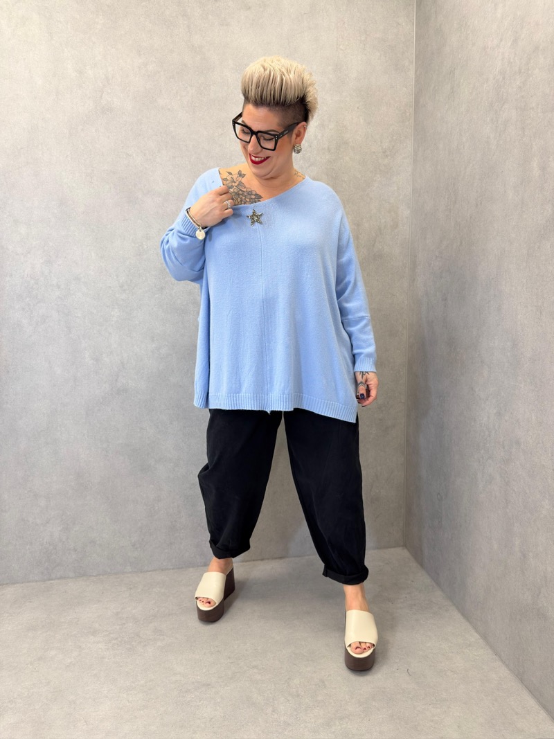 Polyvalent, ce pull grande taille se porte aussi bien avec un pantalon fluide, un jean, un pantalon coupe ballon ou même un legging pour un look casual chic assumé. Il est parfait pour une clientèle à la recherche de vêtements confortables, valorisants et résolument dans l’air du temps.