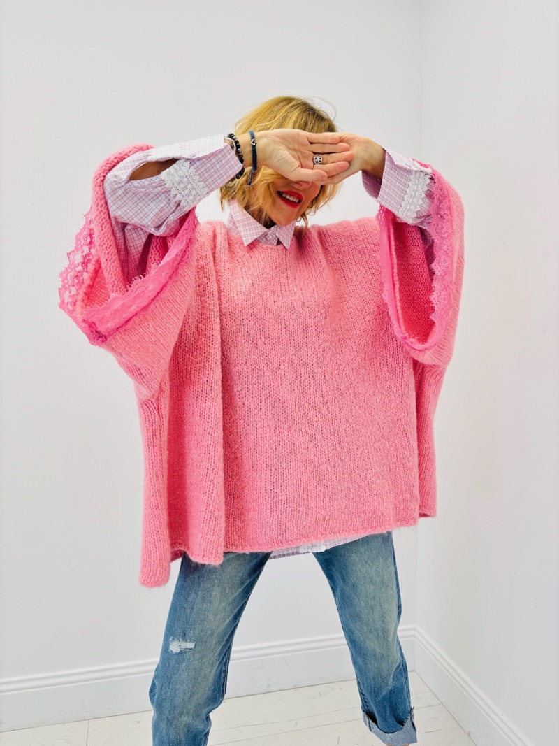 La coupe ample et fluide crée un volume moderne et décontracté, parfait pour un porté loose très tendance. Les manches larges façon chauve-souris renforcent l’effet cocoon et donnent au pull une allure résolument mode. Le détail qui fait toute la différence : les finissions en dentelle délicate au bas des manches, qui ajoutent une touche raffinée et féminine, contrastant élégamment avec l’aspect casual de la maille.