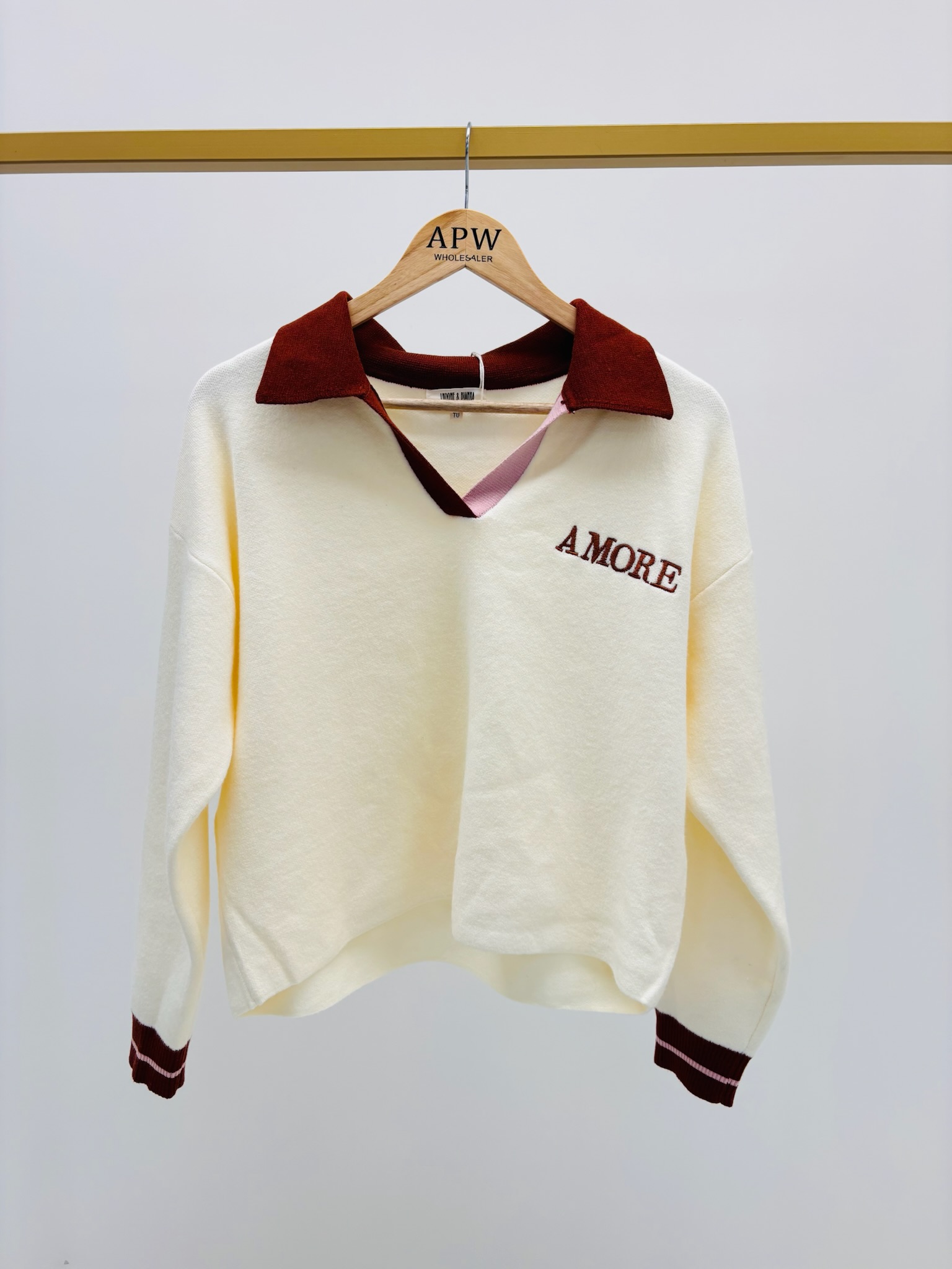 Sa maille fine en viscose douce (45%) assure un tombé fluide et agréable à porter, tandis que son col polo contrasté et son inscription brodée “AMORE” ajoutent une note mode et romantique.