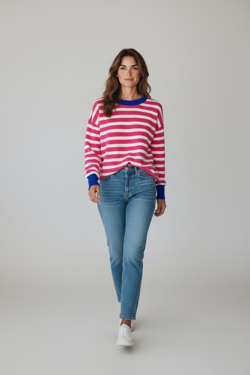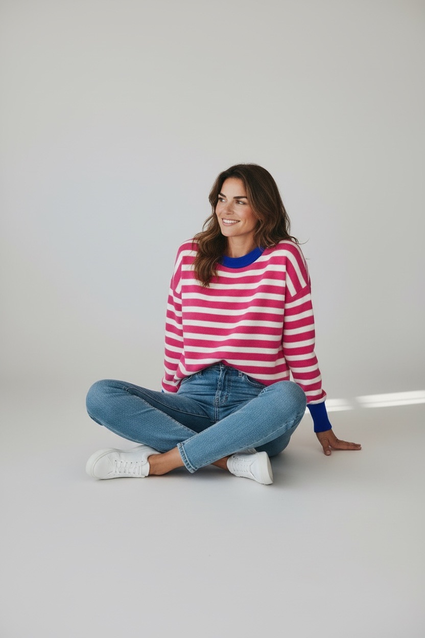Ce pull rayé séduit par son esprit graphique et ses contrastes de couleurs soigneusement travaillés. Confectionné dans une maille douce et légère, il offre un excellent compromis entre confort et style, idéal pour la mi-saison comme pour les journées plus fraîches.