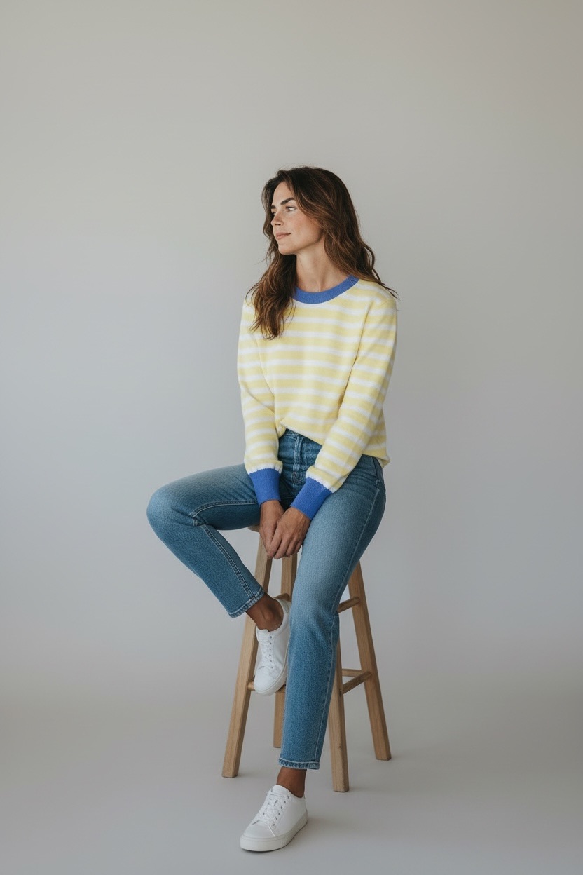 À porter avec un jean droit ou un pantalon fluide pour un look casual chic, ou à associer avec une jupe unie pour jouer sur les contrastes. Idéal sous une veste légère ou porté seul comme pièce forte, ce pull apporte immédiatement une touche fraîche et moderne à une silhouette du quotidien.
