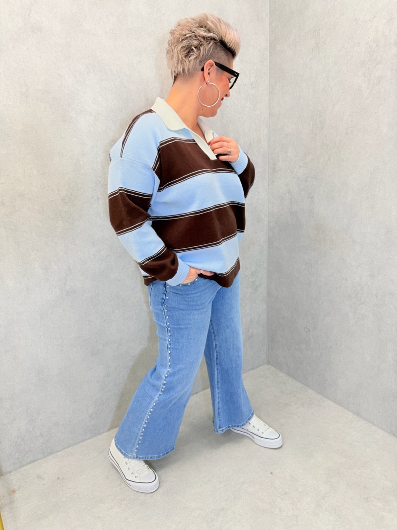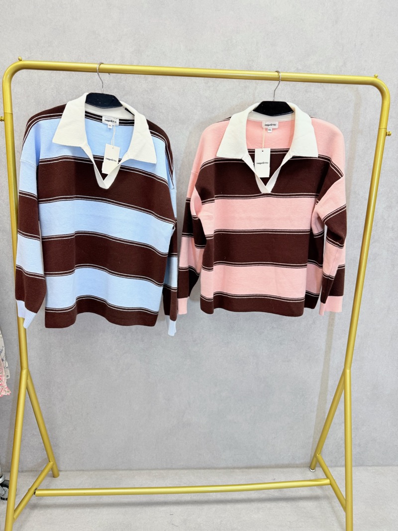 Ce pull grande taille à rayures esprit polo est une pièce forte et tendance, parfaite pour proposer à vos clientes un look à la fois casual, moderne et confortable. Son jeu de rayures horizontales rose poudré et chocolat, subtilement contrastées par de fines lignes écrues, apporte du caractère à la silhouette tout en restant harmonieux et facile à porter. L’association de ces teintes chaudes et douces crée un rendu visuel très actuel, idéal pour la saison.