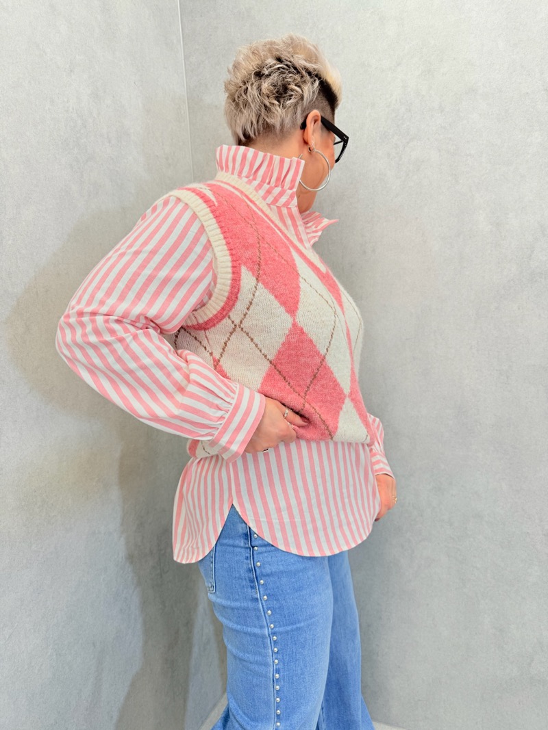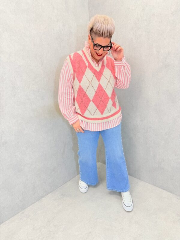 Pull sans manches à losanges rose et écru – Grande Taille – Esprit rétro chic et confort moderne