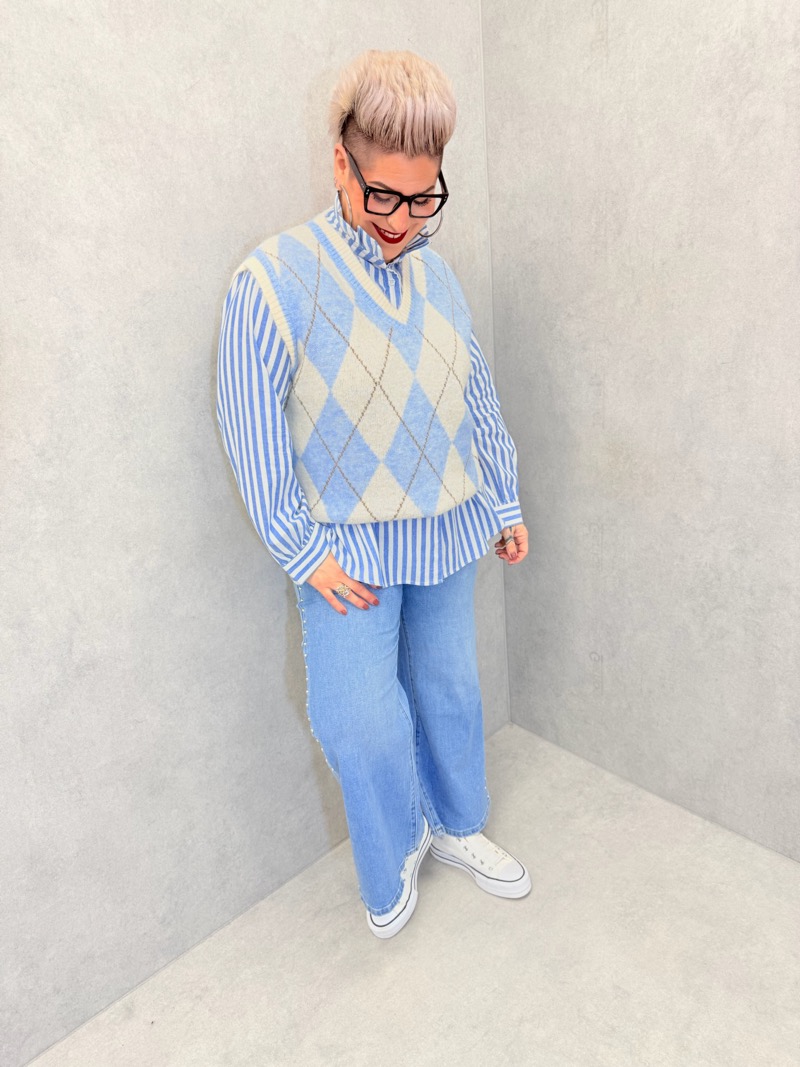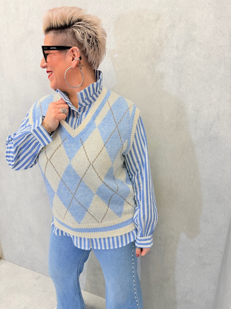 Ce pull sans manches se porte idéalement sur une chemise blanche, rose ou écrue pour un look chic et structuré. Il s’associe parfaitement avec un jean, un pantalon droit ou une jupe pour un style féminin et moderne. Pour une tenue plus élégante, il peut être porté avec un pantalon tailleur et des bottines. Une pièce parfaite pour proposer à vos clientes un look tendance, confortable et facile à adopter au quotidien.